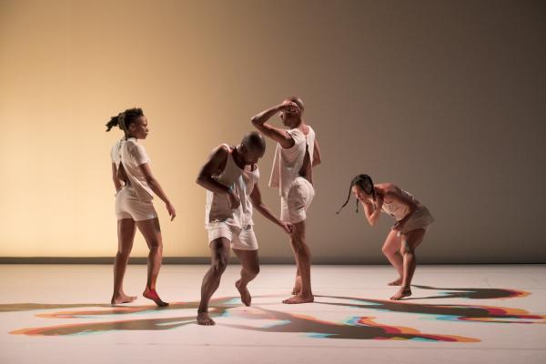 Ils sont donc maintenant tous les quatre, trois hommes et une femme, au centre, bien organisés et comme insérés les uns dans les autres dans un tissage contraint que ne désorganise pas la danse. Le fond luisant comme un écran se répète sur le sol, lumière chaude et chatoyante pour une gestuelle précise et des interprètes affutés dont les déhanchés sensuels sont pourtant calibrés et composés au millimètre. Cela se déroule très efficacement. D'une marche balancée à la file ordonnancée du groupe, l'une faisant face au trois autres, composant le mouvement en système de questions réponses, et affectant une sorte de rivalité, jouant sur la frontalité au public avec quelques décalages pour donner de la profondeur… Se succédant dans les soli comme une quasi battle. Identifiant le mouvement dans des douches lumineuses carrées. Et jouant du trio en tutti face au solo.