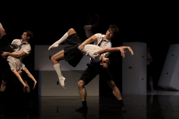Nous sommes à l’école, dans les vestiaires ou en salle de classe où d’énormes cubes blancs figurent l’imposant mobilier qui structure les unissons chorégraphiques. Mais unisson ne signifie pas conformisme chorégraphique ! Au contraire, ce tableau d’école regorge d’inventions, entre portés et acrobaties, enrichies d’une touche burlesque. Il est tentant de faire la comparaison avec les tableaux en salle de classe dans Elektro Kif de Blanca Li, où les jeunes s’expriment de façon apparemment individuelle et libre. Ici comme là, l’unisson fait la loi, et on se rend compte que sous le déluge de coloration vestimentaire se cache une autre uniformisation.