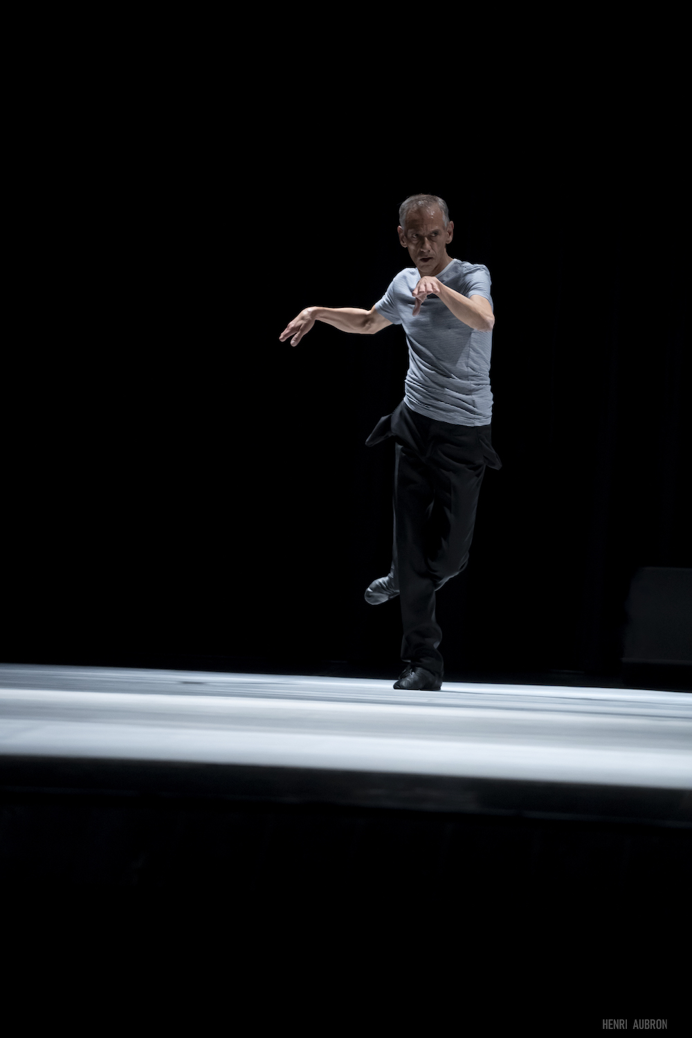 Le « mister » (ou mystère) du titre n’est autre que Buster Keaton esquissé/esquivé par Pedro Pauwels dès l’entame de sa variation en deux temps trois mouvements : deux courses rapides en diagonale avec sortie de la salle et claquements de portes et clignotements lumineux comme ceux de l’œil de la caméra ou du défilement saccadé de la pellicule dans un projecteur.