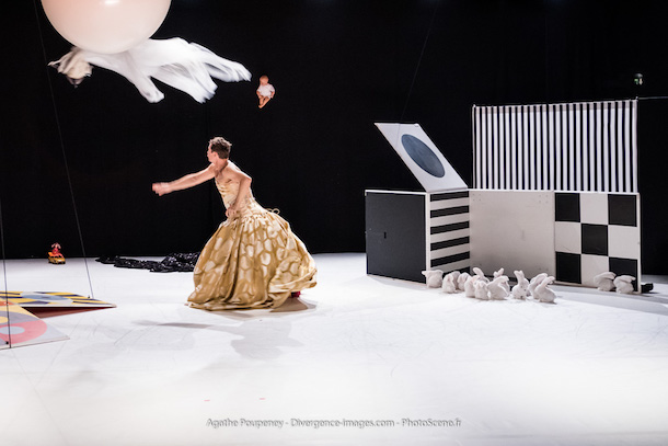 Côté accessoires, nous avons donc: Des ballons à sauter, la marionnette ballerine suspendue au plafond, des peluches, des boules coloriées et carrément tout une scénographie-paysage, faite de boites et d’écrans télé, écrans sur lesquels passent des JT des années 1960 et 1970. On revit, entre autres, l’introduction de la télévision en couleur et l’ouverture du Centre Pompidou.
