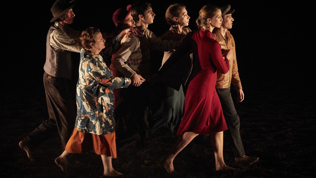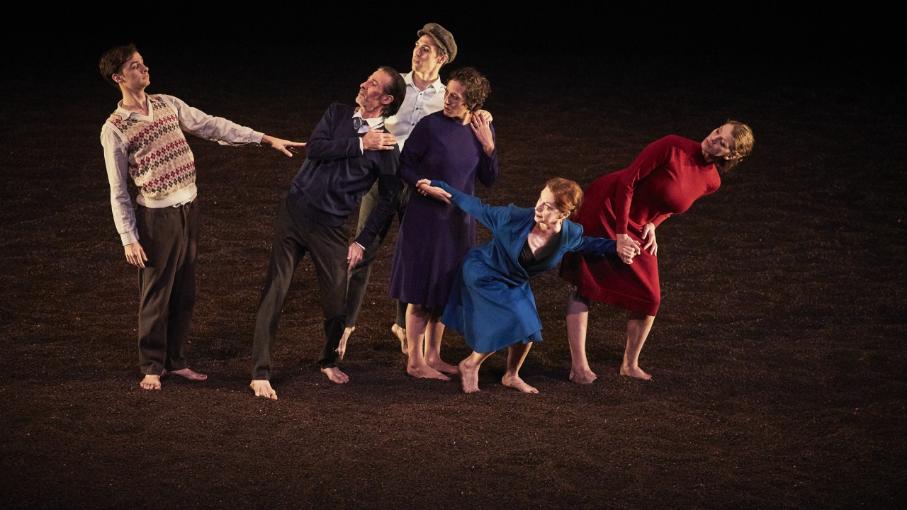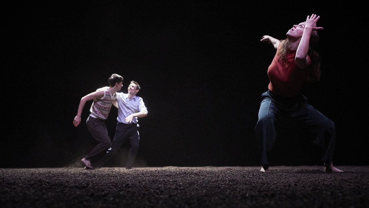 Sur un sol couvert de terreau, les interprètes se révèlent être d’aussi excellents comédiens que danseurs. Avançant en unisson sur un rythme binaire, ils traversent l’espace, disparaissent et reviennent, comme dans un mouvement sans fin. Ils sont des migrants, des Européens à la recherche d’une nouvelle espérance et de nouvelles terres.
