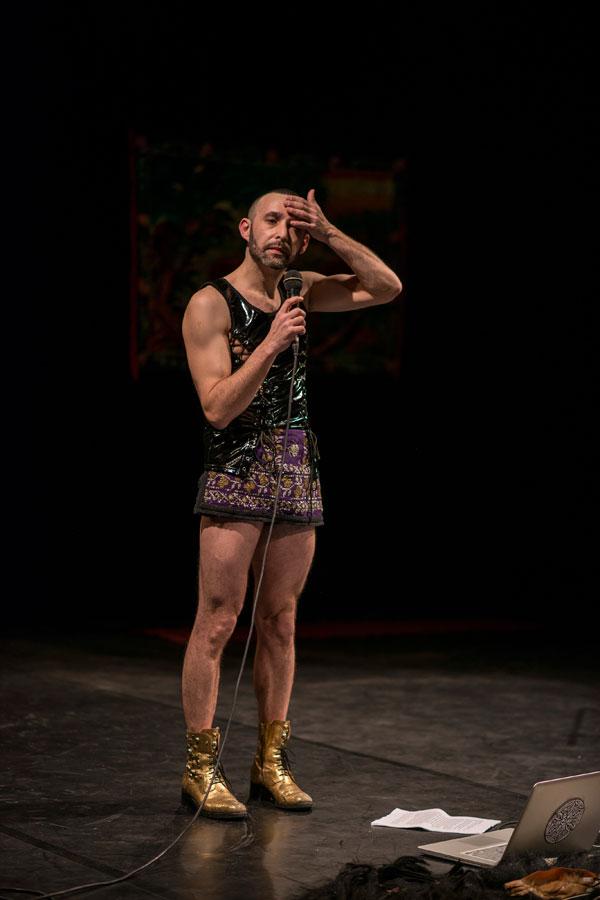 En latin médieval, realia désignait « les choses réelles ». Mais qu’est-ce qui ressort à la réalité dans ce spectacle ? Peut-être la deuxième partie du titre signalant un itinéraire digne de l’Orient Express. Car ce Farid Fairuz n’est autre qu’un certain Mihai Mihalcea, apparu en France en 2002 à Paris Quartier d’Été, puis au CND et avait (déjà !) présenté un solo intitulé 5 minutes of my Life qui pointait déjà son goût pour l’autobiographie déjantée. Farid Fairuz, avatar donc de Mihai, nous propose une sorte d’autofiction un peu schizophrène puisqu’il met en scène ses deux moi – l’ancien et le nouveau, avec juste un petit détail pour le reconnaître : les chaussures dorées ! (qu'il portait déjà en 2002, mais version escarpins).
