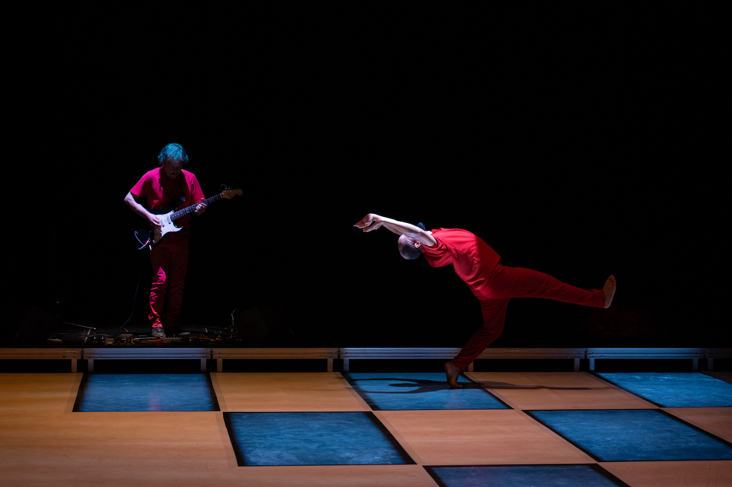 Alors que les lumières changent les couleurs du sol et des costumes, l’excellent guitariste exécute un solo à la Jimi Hendrix et revient vers des styles parfois épurés parfois plus provocants en corrélation avec la chorégraphie superbement interprétée. Car il s’agit d’un duo dans lequel s’exacerbe la vérité brute et nue de l’homme. Chaque muscle dessine une histoire, chaque déplacement fait vibrer le temps. Avec Hors du monde, le chorégraphe démontre à quel point il est pointilleux car chaque pas de danse, chaque note de musique a une signification bien particulière.