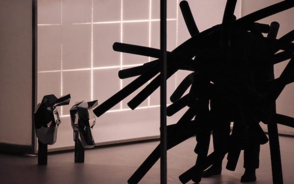 L’installation d’Eric Arnal-Burtschy, vue au Gymnase roubaisien, peut faire songer au mythe de la caverne, aux attractions foraines genre palais des glaces ou train fantôme, aux illusions d’optique, astuces perspectives et infinis pavages en trois dimensions d’un Maurits Cornelis Escher. Et également, en raison de sa non figuration, aux modulations de lumière de Laszlo Moholy-Nagy, aux explorations infographiques d’un Stan Vanderbeek ou d’un Ryoji Ikeda, ainsi qu’aux « light cones » d’un Anthony McCall ou d’un Giovanni Martedi. Pour ce qui est de la danse, le dispositif est voisin de celui qu’utilisait Stéphanie Aubin dans Ambiente (2013) : un vidéo-projecteur fait face à l’observateur, dessine ou décline une infinité de lignes et de plans perspectifs rendus tangibles (ou presque) par des écrans de fumée.