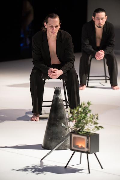 La chorégraphie, comme la musique, est répétitive, cyclique. Elle prend une forme canonique ; les danseurs arrivent un par un ; ils s’expriment en solo ou reprennent une phrase en écho ; ils forment duos et trios et évoluent à l’unisson ; les portés se font en douceur ; les interprètes jouent avec les objets à disposition ; l’un grimpe sur un tabouret ; l’autre transporte un seau noir ; un troisième use d'une façon absurde d’un portevoix ; un poste de télévision fait office de réchaud ; une femme tient dans ses mains un bouquet de fleurs calcinées ; ils se penchent et tanguent ; ils multiplient entrées et sorties de scène. Comme la nature, la danse demande à être contemplée. La fascination et l’attention portée à chaque geste et à la moindre vibration sont telles que le spectateur ne sent pas le temps passer.