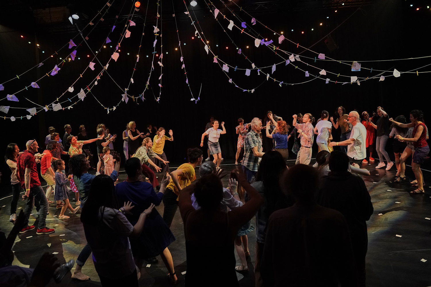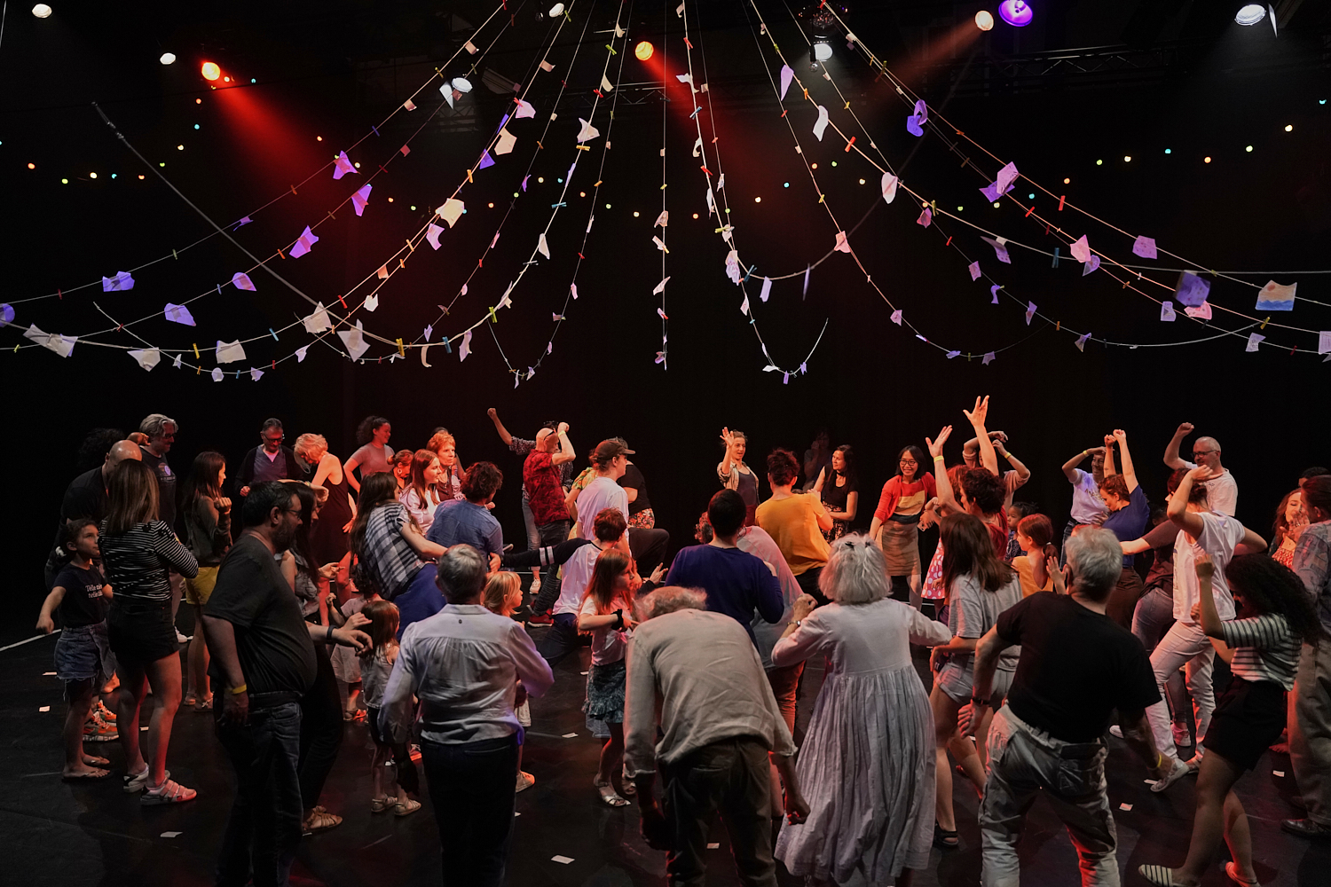 Et à l'intérieur, passé le rideau, la gniangnianterie continue. Et tout le monde s'est assis, les petits devant, les grands derrière et Ambra Senatore qui se met à danser. Il faut reconnaître que, passées les élucubrations sur les petits cailloux, cela bouge drôlement bien et même qu'on en oublierait le tropisme éducatif et les trucs pour faire bouger le public. Et tous qui répètent et refont. Il y a un peu de musique qui arrive et la Senatore, toujours et avec cette fluidité narquoise, comme une danse avec un sourire en coin, séduit. Deux comparses s'en mêlent, Cécilia Emmenegger et Lisa Guerrero, pas manchotes non plus au demeurant qui s'empressent d'assister la patronne dans la récolte des petits cailloux péniblement distribués au préalable à l'assistance. Faire et défaire, c'est toujours redanser et force est de reconnaître que tout ce monde témoigne d'une belle imagination dans l'improvisation et que les cailloux sont collectés en moins de temps qu'il n’en faut pour ronchonner. Elles sont meilleures danseuses que comédiennes et l'on ne croit pas un instant à cette histoire de la boîte des dessins qui a été oubliée et tous ces petits papiers qui tombent comme par inadvertance des cintres ; après tout, l'occasion est belle de les regarder toutes les trois s'employer avec ce même enjouement à fixer les paperolles aux brins de guirlandes lumineuses descendues. Cela forme comme les nervures d'un chapiteau réduit à l'idéal : l'idée d'un lieu de spectacle qui n'aurait d'existence que dans l'évocation. Et les trois manutentionnaires en chorégraphie incitent l'assistance à pénétrer l'espace en se plaçant sous un dessin ; astucieuses, elles suggèrent surtout de venir s'installer sur l'un des multiples petits bouts de gaffeur qui ponctuent le plateau. Et voilà que tous, et sans le mesurer, viennent de se confronter à l'espace : celui du plateau et le leur, en propre, délimité par celui qu'occupe les autres. Jolie leçon.
