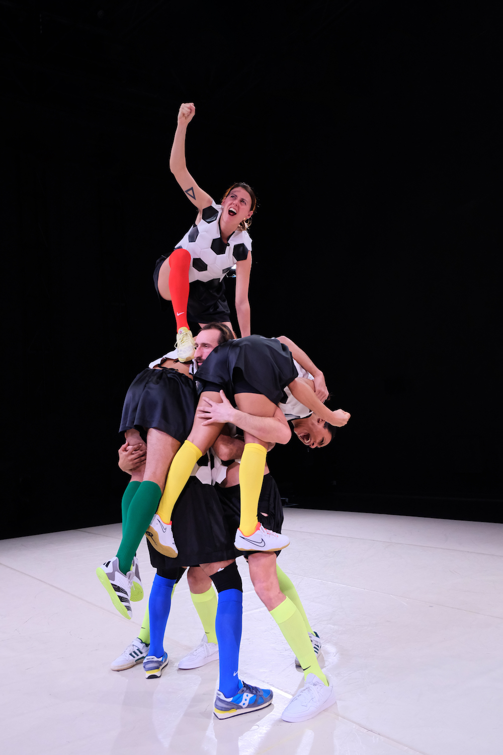 Trois-quarts d’heure durant, le sextet formé par Tristan Bénon, Meriem Bouajaja, Prunelle Bry, Mohamed Chniti, Mohamed Fouad et David Ramalho évoluera en tenue de sport siglée Gwendoline Bouget, sous « l’éclairage de stade » de Thierry Meyer et sur la musique d’Éric Lamoureux jouée live. Le rituel du match fait de toute évidence office de livret chorégraphique, qui débute, comme il se doit, par un temps d’échauffement de la petite troupe à base de « claquements talons-fesses, crissement du cuir et cliquetis des crampons ». Le vacarme du public devrait accompagner le coup d’envoi de la première – et dernière – mi-temps footballistique.