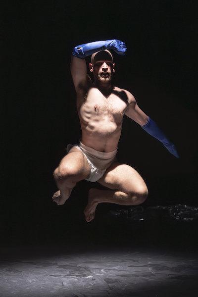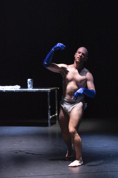 Les gestes de Noy, dansant, se codifient en symboles abstraits et formels, renvoyant à d’autres, potentiellement fictifs. La danse pure, ici, n’existe pas, même pas dans ses pas et gestes liés à la tradition. Pour le reste, tout geste est de pure symbolique. Tantôt la tête de Noy disparaît entre les épaules, tantôt le tribun triomphant se met à trembler. La masculinité exacerbée et forcément nationaliste se drape de couches pour bébés (un clin d’œil à la bizarrerie de certains supporters de Donald Trump qui font l’éloge des hommes en couches pour adultes ?) et de gants bleus.