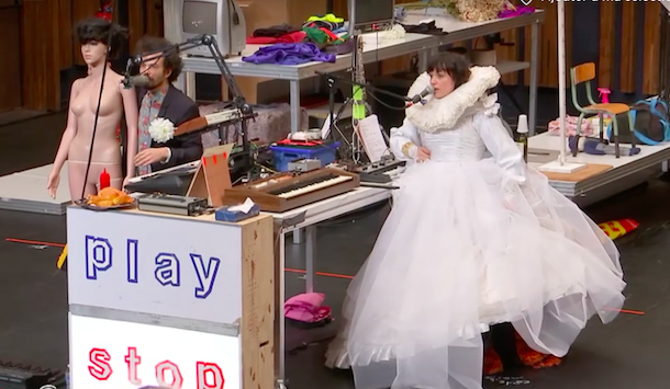 Totalement et heureusement inclassable, le spectacle commence donc par la revue n°1, (il y en aura 10) nommée « striptease », en réalité un « Frégoli » de la plus pure tradition, à vue et sans rideau. Infante, tahitienne, Miss France, curé, en ceinture de chasteté ou culotte en crochet qu’elle détricote, le tout (il faut bien corser un peu l’affaire), réalisé avec un mannequin de vitrine en équilibre sur la tête, Vimala Pons est d’une virtuosité précise et d’une expressivité exquise. L’équilibre ça la connaît, se succèderont au somment de son crâne, comme autant d’images métaphoriques, une colonne grecque, un bouquet de fleurs fanées, une planche en bois, un escabeau, une machine à laver… un inventaire domestique à la Boris Vian où l’on pourrait ajouter aux strophes « Un frigidaire, un joli scooter, un atomixaire et un Dunlopillo … Une cuisinière Avec un four en verre, Des tas de couverts, Et des pelles à gâteaux… » *, « un lancer de couteaux ». Lancer que Tsirihaka exécutera avec une certaine fougue (est-ce bien Trump et Poutine qu’on aperçoit en toile de fond ?)