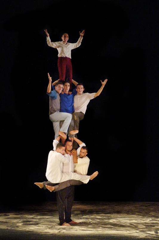 Ces bassines, vont d’ailleurs servir tout au long du spectacle : retournées au sol, elles permettent une danse rythmique et sonore ; sur la tête, elles deviennent les tremplins qui servent à se propulser dans des pyramides humaines aussi vertigineuses qu’impressionnantes. Il y a des scènes très drôles, comme celle du vol de chaussures – dans les deux sens du terme ! Des moments où l’on frôle la transe – circularité oblige.