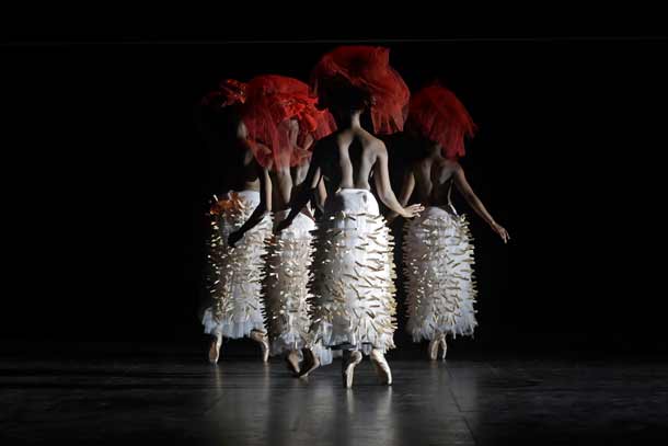 Donc, pointes au pied et torses nus les danseuses et danseurs, explorent le hiatus entre leurs corps et les conventions classiques avec une élégance subtile, et une lenteur propice à délier les imaginations. La gestuelle est presque rituelle, avec ses poses et ses pauses, ses gestes mesurés qui s’élèvent ou se cassent, se dévoient d’une accentuation de la tête ou d’un épaulement un peu bizarre, un bras qui se lève