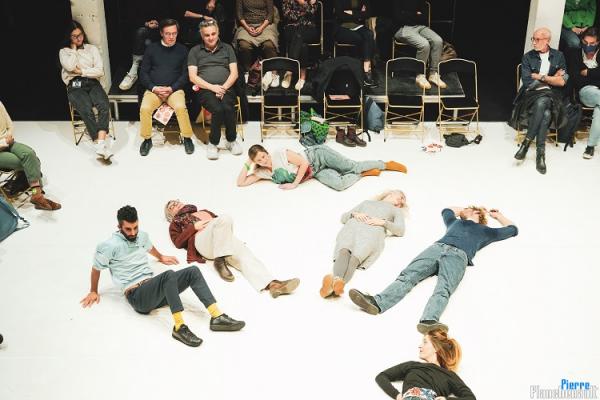 Mais l’acte final est à venir. Après avoir aidé un danseur à expier sa violence intérieure, ses camarades l’amènent dans la salle ! Juste après, deux danseurs se tombent dans les bras, se serrent et puis, proposent le même réconfort aux spectateurs, non sans s’enduire les mains de gel hydroalcoolique. Safe hugs, en quelque sorte… Et pourtant ils transpirent, et pourtant beaucoup, dans la salle reçoivent ce geste avec bonheur, après quelques hésitations.
