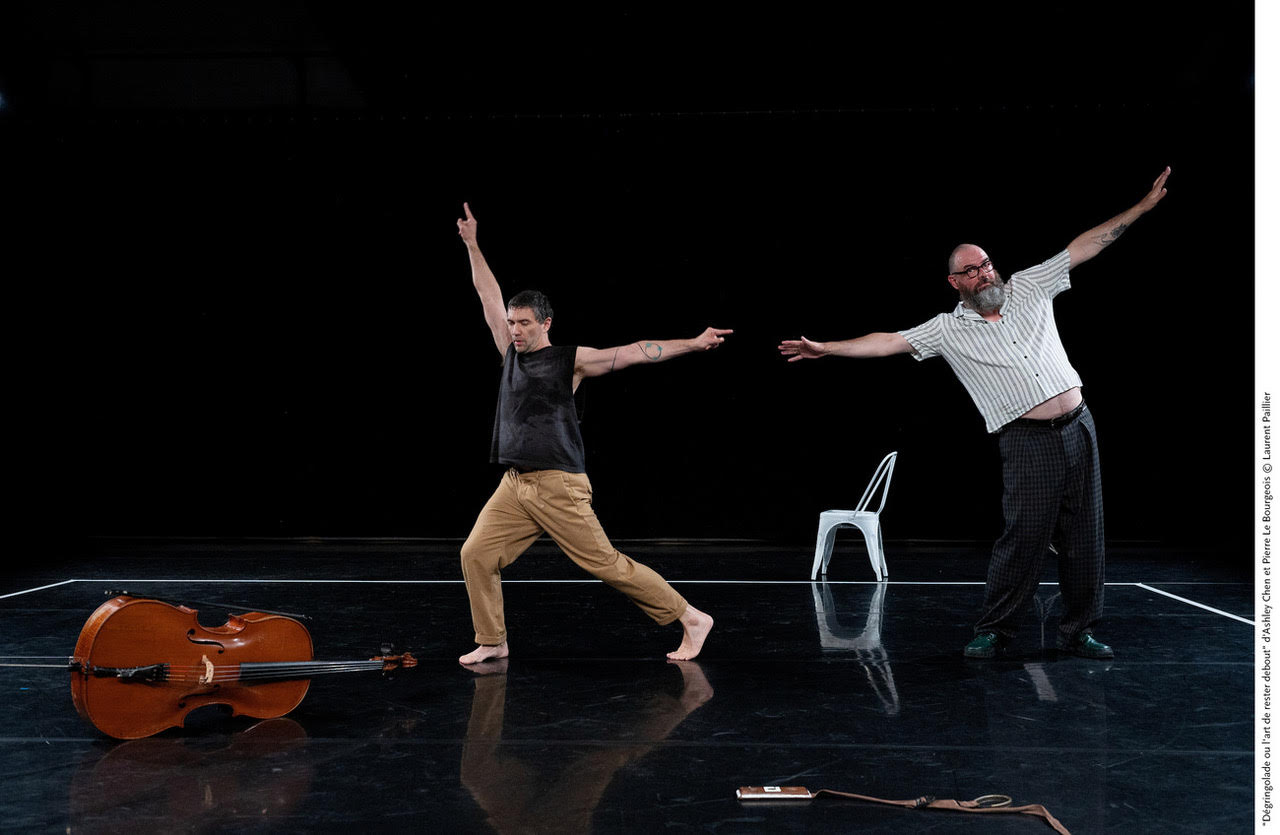 En seconde partie de soirée, Ashley Chen entremêle souvenirs et interrogations sur ses interprétations accompagné par le violoncelliste Pierre Le Bourgeois dans son avant-première Dégringolade ou l’Art de rester debout. Entre un retour sur son parcours de danseur et la prolongation de son travail, ce duo fait songer à deux adolescents des années 90 qui s’amusent et font ressentir une profonde complicité.