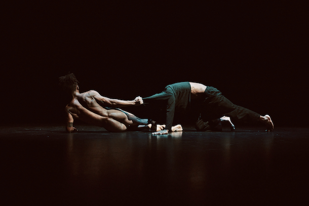 Prenant le contrepied de la boîte noire en choisissant un sol et un fond blanc, Mufutau Yusuf convoque certains codes de la migration, comme ces sacs rayés en nylon coloré empilés sur scène tel un totem des temps modernes. Cette masse va s’animer, tanguer d’un côté et de l’autre avant de commencer à se déplacer. Les gestes sont empruntés à la danse traditionnelle et au vocabulaire contemporain, les trajectoires se dessinent en diagonale ou en passant de cour à jardin et inversement jusqu’à se transformer en danse frénétique. Puis la figure disparaît dans les ténèbres, tandis que la bande-son enfle comme le grondement d’une mer déchaînée. Apparaissent en fond de scène deux silhouettes de dos, l’une nue s’accrochant à l’autre, habillée d’un pantalon et d’un tee-shirt sombre et couturé. La lumière rasante éclaire les muscles saillant sous l’effort, celui de tenir, pour ne pas tomber. L’allusion est sibylline, presque trop appuyée. Mais vite balayée par l’intensité qui se dégage de ce corps dénudé pourtant vulnérable.