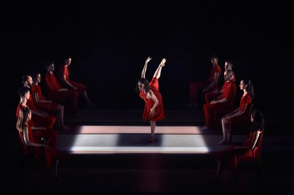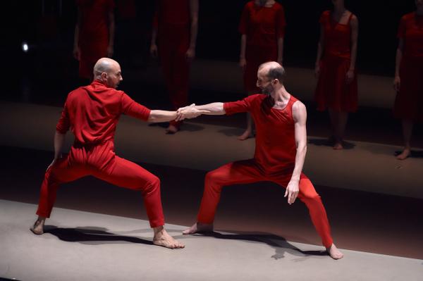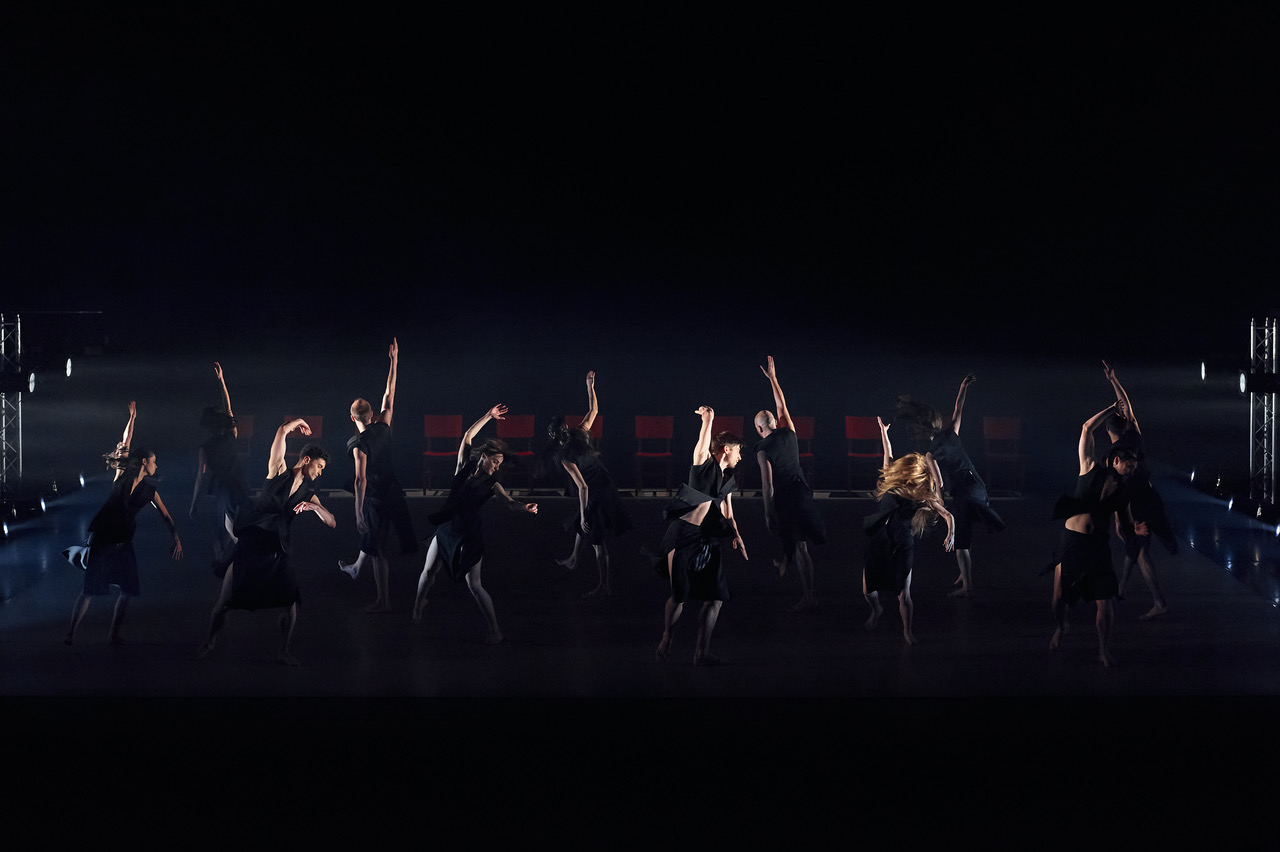 La scénographie et tout le système de l’œuvre évitent les références anecdotiques ou toute évocation historique. En fond de scène, une rangée de chaises rouges sur laquelle patientent tous les danseurs ; ils portent de fluides costumes, noirs dans la première partie, rouges dans la seconde, aux lignes modernes ne se situant dans aucune époque particulière. L’ensemble, design et élégant, possède aussi une charge dramatique diffuse. Quelque chose d’une tension sourde qui s’exprime clairement dans cette marche descendante quand s’engage la pièce. La Grosse Fugue (Op 133), avec son introduction, un appel d’archet, un silence puis un exposé d’où sort un thème fragile qu’étouffe littéralement une cavalcade de traits donne à cette marche obstinée une gravité saisissante. Ce morceau constituait initialement un aboutissement, la conclusion de l’opus 130.