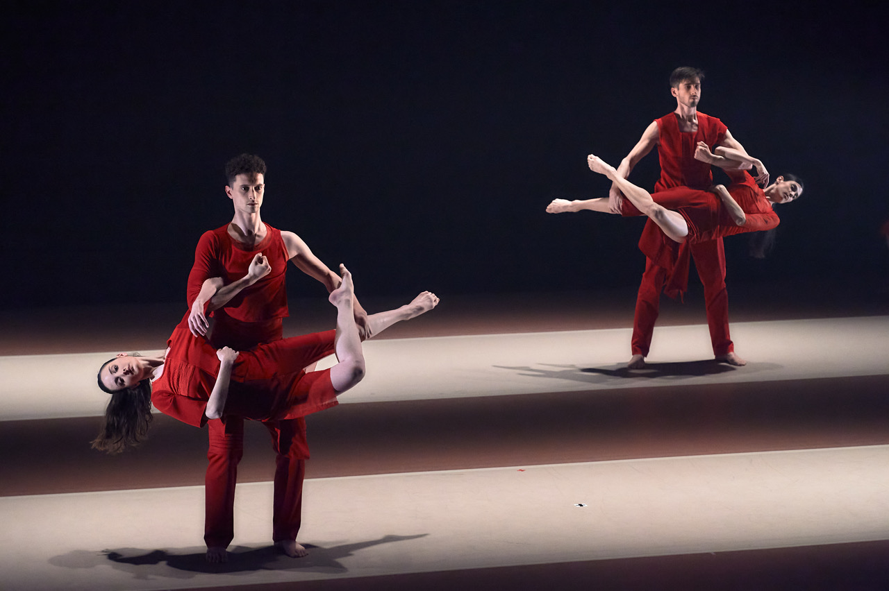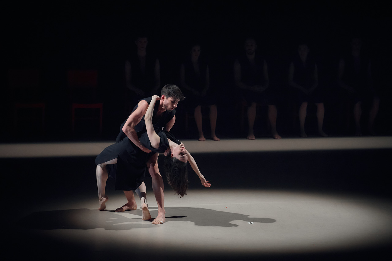 Et l’on perçoit parfaitement la démarche dans cet incipit. La marche se mue en injonction, le groupe s’organisant en deux ensembles de six danseurs en canon, puis chutant avant de revenir aux chaises tandis s’achève la fugue, laissant un couple, Lisa Lanteri et Graham Kotowich, comme une laisse de mer, sur l’adagio du Quatuor n°1 (op. 18), celui-là même que le compositeur avouait avoir composé en songeant à la scène du cimetière de Roméo et Juliette… Et de fait la dimension sensuelle et tragique dessine puissamment la gestuelle de ce passage.