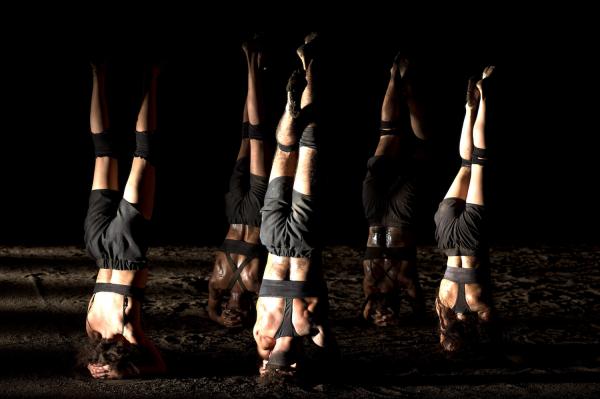 Sous les lumières très étudiées de Cyril Leclerc, apparaissent les interprètes. L’un d’eux se lance dans des tours en équilibre sur une main en provoquant un tourbillon de poussière. Splendide image ! Puis, alors que tous bougent rapidement les bras, les éclairages découpent ces mouvements comme si les danseurs désiraient s’envoler.