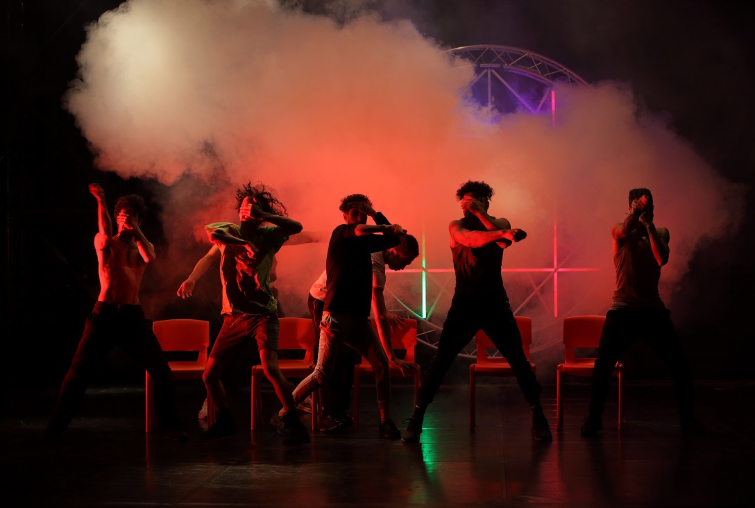 Ils ont entre 21 et 27 ans et amènent une énergie fulgurante. Sept garçons du Caire, d’Alexandrie et d’ailleurs en Égypte : quatre danseurs et trois rappeurs-chanteurs. Sur scène, leur fête se fait sans frontières entre les langages artistiques. Il y a un micro pour chacun et les vocalistes se jettent à leur tour dans la cadence infernale de certaines chorégraphies. Itmahrag est donc ce qu’on peut appeler, plus que jamais, un concert chorégraphique. Et pourtant, à la Filature de Mulhouse, le seul instrument de musique sur la plateau ne brilla que par ses LEDs: Le grand gong de l’Orchestre Symphonique de Mulhouse, configuré pour l’occasion en grande roue à tubes lumineux, formant un moucharabieh très coloré. Pour la tournée, il va cependant falloir trouver d’autres idées scénographiques…