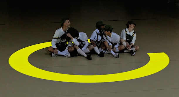 Quand la troupe revient, ce n’est plus elle. Les danseurs, masqués, jouent avec des objets gonflables d’Oktoberfest. Les bretzels géants en bouées portées, les chopes de bière gonflables, les masques grotesques composé d’une sorte de dé à coudre géant piqué de deux ovales noire, les mains gantées à la Mickey, font basculer la kermesse en étrangeté. Une diagonale entasse ce merchandising de Fête de la bière, vite parcourue à pas comptés par un danseur. Le cercle a perdu son aura, il ne reste qu’une farce dépressive, laïcisée, grotesque. Comme si, après une grande interruption où le plateau est déserté, l’espoir d’un collectif authentique n’était plus possible.