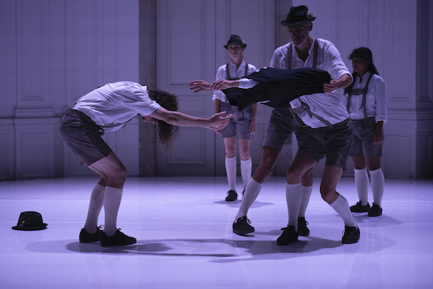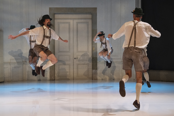 Ils entrent comme sortis d’une carte postale : culottes bavaroises, chaussettes blanches serrant les mollets, sérieux impassible. On sent déjà que chez le chorégraphe, rien n’est jamais stable : le folklore est un terrain d’expérimentation où le cercle, censé unir, devient le lieu du conflit. Derrière une colonne sonore allant de Bach à Pink Floyd et Daft Punk, se déplie une méditation sur l’identification, la dissidence et la possibilité — ou l’impossibilité — de danser ensemble.