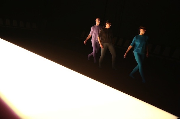 Ce parcours, riche en métamorphoses, ne serait qu’une jolie façon de se situer dans une danse post-cunninghamienne, plutôt abstraite mais néanmoins ouverte à toutes sortes d’imageries et d’imaginaires, si le spectateur n’y faisait pas une véritable expérience du regard. Quand le trio quitte la salle après la première et la deuxième séquence, on se lève pour échanger sa place contre une autre, plus proche ou plus éloignée, en faisant basculer son angle de vue de 90° ou 180°.