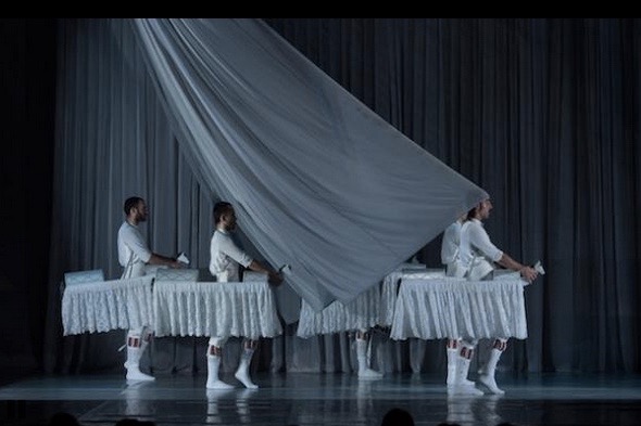 Le chorégraphe Marcos Morau (La Veronal) a parfaitement bien su tisser les liens entre légendes et vérités. La scène de la pelote basque dansée au ralenti est splendide. Les rondouillards épouvantails à oiseaux, effrayants et irrésistibles, l’homme au drapeau rouge évoque les longues querelles. Puis une séquence met en avant les charmants costumes d’époque, comme la danse du chevalet où l’homme batifole allègrement ceinturé par son canasson en dentelles et carton pâtes.
