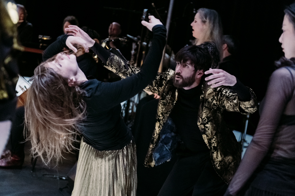 C’est par les énergies et les ambiances que nous sommes bel et bien dans cette Espagne profonde de Bernarda Alba, l’héroïne de Lorca, des traditions et d’un certain obscurantisme. Sur leur chemin de rotation antihoraire autour des musiciens, rarement interrompue, les interprètent incarnent ou croisent l’être aimé, des bals, des fantômes ou autres liaisons dangereuses et bien sûr des magiciennes aux gestes ténébreux et expressionnistes. L’ivresse et la tendresse se superposent comme l’or et le noir des très beaux costumes signés Aïcha M’Barek.