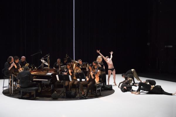 Quand la nuit se dissipe sur le plateau blanc, on distingue dix-sept silhouettes humaines. Progressivement la foule va se séparer en deux sphères distinctes, l’une entourant l’autre. A l’intérieur, un centre de gravité à la densité d’une étoile fixe. C’est l’orchestre. Autour d’eux, les danseurs, au nombre de six. Aussi vont-ils graviter autour des musiciens telles des planètes, et pourtant libres. Séparation et fusion ne sont plus qu’un seul et même phénomène et le partage circulaire du plateau s‘impose d’emblée comme une évidence. C’est assez étonnant en soi.