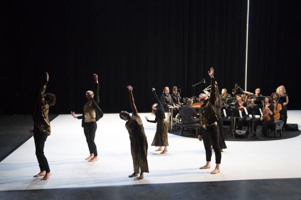 Ce concert chorégraphique pour dix musiciens, une chanteuse et six danseurs, créé dans le cadre de la Biennale du Val-de-Marne, ne manque pas d’audace. Pour la première fois, Aïcha M’Barek et Hafiz Dhaou travaillent avec des musiciens sur scène, si on fait abstraction des deux spectacles précédents, où un DJ était présent au fond du plateau. Et pour la première fois, ils chorégraphient des unissons. Le virage est donc spectaculaire pour les fondateurs de la compagnie Chatha.