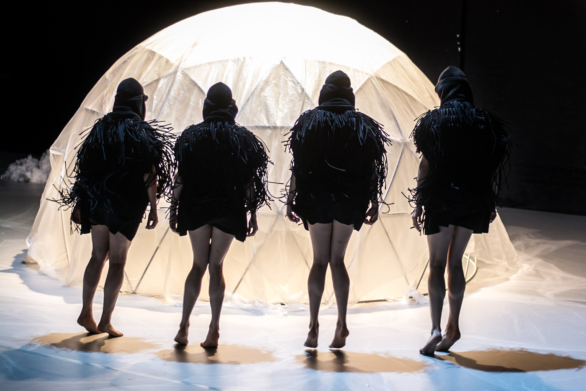 De vagues images d'eaux tumultueuses et panoramiques enneigés, à quoi s'ajoutent sur scène un genre d'igloo tech un peu ridicule et quelques tas de glace assez merdiques, conduisent à penser que cela pourrait venir du nord ; du Grand nord. La feuille de salle vient alors à la rescousse pour nous dire qu'en effet, la chorégraphe s'est préoccupée, très fort, du combat des populations amérindiennes autochtones, pour affirmer une culture toujours vivante malgré le génocide.