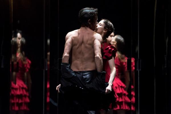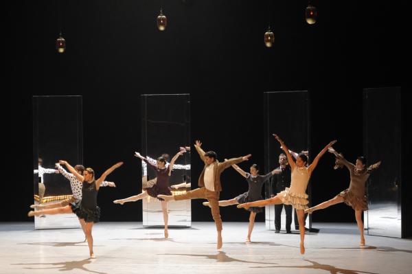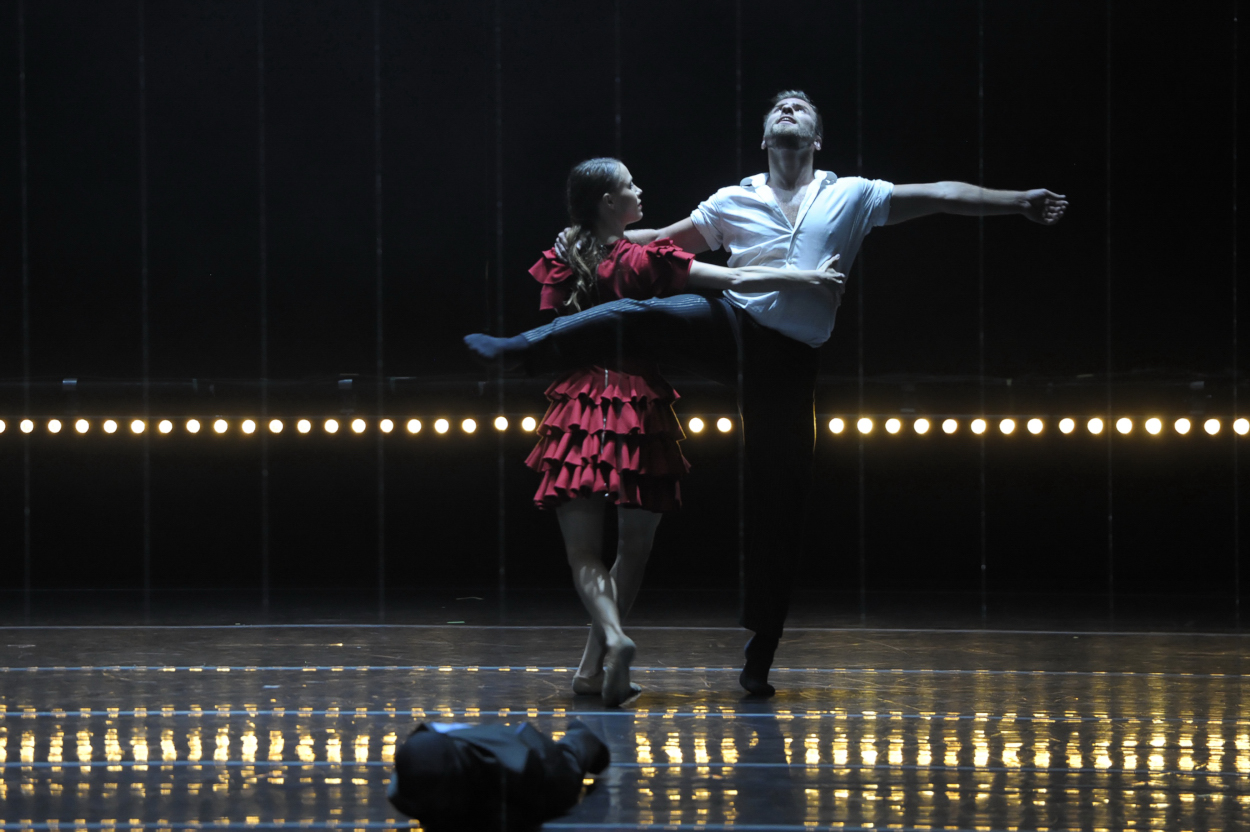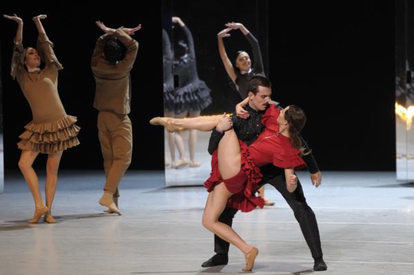 Les costumes espagnols stylisés, et les astuces scénographiques mettent en perspective, au sens figuré, mais aussi au sens propre avec ces panneaux-miroirs, le ballet.