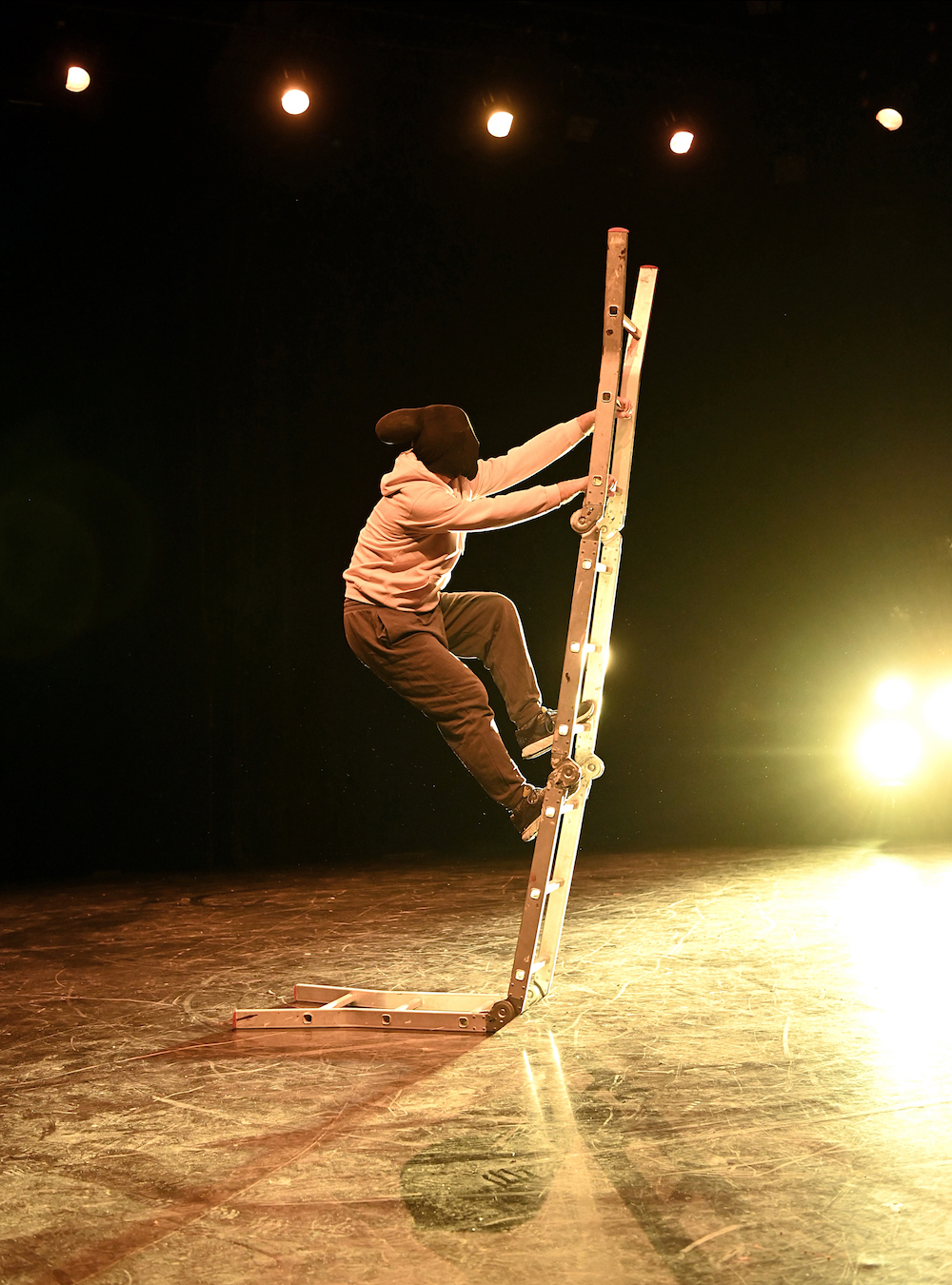 David Brandstätter de la compagnie shifts - art in movement, nos artistes associés, crée un solo qui s’appelle CouRage. Il y amène une dimension un peu politique avec des interrogations sur la peur, la colère et le courage qu’il nous faut aujourd’hui pour affronter ces événements qui nous tombent dessus. On pourrait parler d’un duo, puisqu’il joue, au sens propre comme au sens figuré, avec une échelle.