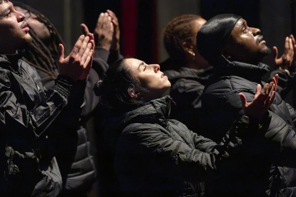Ils sont maintenant quatre, visages masqués, à s’emparer du plateau. Ils envoient valdinguer les fleurs, les portent comme un cercueil. L’un d’entre eux, assis, tient sa guitare telle un fusil. Comme le confiait Marina Gomes à Agnès Izrine, la « guitare » n’est-elle pas à Marseille le surnom donné à la kalachnikov ? Une nouvelle bande son s’invite : « Ils nous voient comme des voyons, des bandits, mais il n'y a pas de méchants ici, sauf ceux qui font du trafic ». Une foule envahit la scène : une douzaine de danseurs et danseuses qu’accompagnent une trentaine d’amateurs. Entre unissons en groupe et solos, entrée et sorties, ils forment sur les notes que Jean-Sébastien Bach a inspirées à Arsène Magnard une communauté vivante et vibrante. Dans leur élan, composé avec talent par Marina Gomes, ils finissent par entonner en chœur sur un air bien connu « Frère Bach ou es-tu ? ». À moins que ce ne soit « Frère BAC » ?