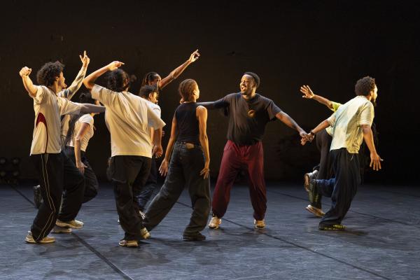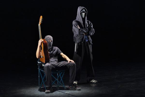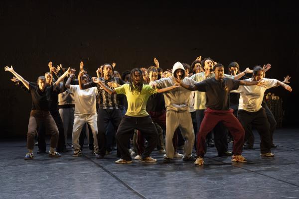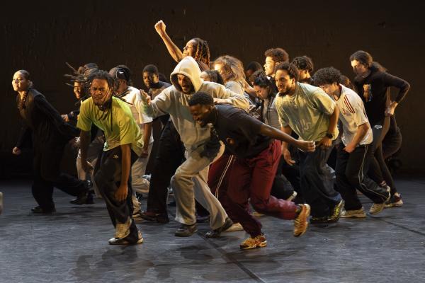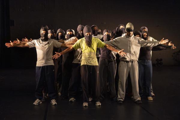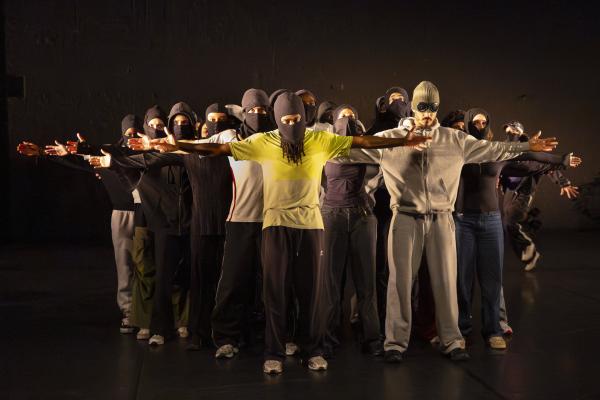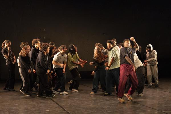 Ils sont trois sur un banc en fond de scène, une affalée sur une chaise tout près de nous. Un autre débarque dans les travées de la salle, gouailleur, rieur, un brin provocateur. « Oui ma gâtée » lance-t-il comme on le dit si souvent à Marseille. Il nous parle du Prado, de nous prendre notre Audi ou plus encore, de « dead ça », avant de grimper sur le plateau pour danser un reggae qui colle bien avec ses dreadlocks. Peu à peu tout le petit groupe s’anime. Ça drible, ça s’embrouille, ça rigole, ça se défie, ça marche à l’unisson, ça se sépare et se retrouve, ça papote. Ça danse aussi, bien sûr, entre figures de break au sol et techno toute en bras. Il y un peu de tension dans l’air, du désœuvrement, mais aussi de la joie et de la complicité, des « hugs », il est encore midi. Quand la pénombre envahit le plateau et qu’un cri retentit, toute la petite bande disparaît dans les coulisses tandis que la musique devient assourdissante. Lorsqu’ils réapparaissent ils sont vêtus de blousons et encagoulés, ils jouent des pieds, des poings, sautent puis se jettent au sol, il est maintenant minuit.