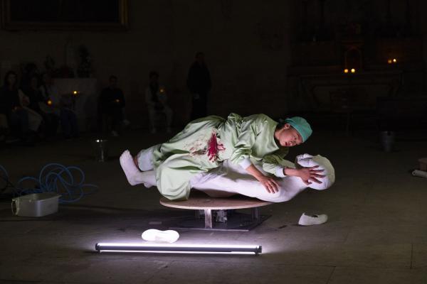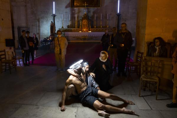 Eurudike De Beul, la mezzo-soprano fidèle à Peeping Tom, jouait ici une bonne sœur et ne déballa sa voix que face au fou qui, le torse nu et gesticulant de façon apparemment désordonnée, se laissait finalement amadouer par le chant. Il y avait la femme qui, debout sur une plaque tournante, se laissait emballer par une autre, prenant soin d’elle et l’attachant en même temps. On trouva, entre les chaises de la nef à l’orgue, un homme qu’on voyait prendre forme sous les mains de la sculpteuse, tel un Golem sous nos yeux à partir d’un bloc d’argile imaginaire.