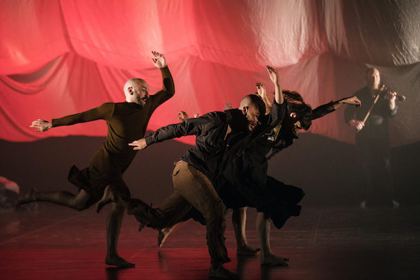 Musique et danse se mêlent jusqu’à se confondre. Les musiciens, hors de la fosse d’orchestre où ils sont en général consignés, peuvent être pris pour des m’as-tu-vu. Ils sont au nombre de cinq : Yann Deneque (le saxophoniste et chef de bande), Julian Babou (à la basse et à la guitare), Cédric Gilmant (au tuba et au serpent), Antoine Marhem (au violon mais libre de ses mouvements) et Malik Berki, le frère de Farid (à la boîte à rythmes, celle-ci étant tenue en bandoulière pour lui permettre de bouger et de se montrer). Une fois sortis du néant, de l’anonymat, de l’invisibilité, les êtres rampants passent à la verticalité, à la danse debout. Et, à partir de là, la chorégraphie est, comme d’habitude, impeccable. Élégante, fluide. Plus que jamais, nous a-t-il semblé, les mouvements sont exécutés à l’unisson, en synchronie ou osmose avec les musiciens du collectif du Tire-Laine. La proximité ou fraternité entre danseurs et musiciens relève sans doute aussi de cet état d’esprit.