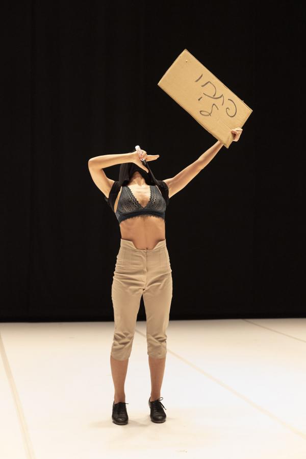 Look Down, un solo signé Naya Binghi, joue sur une sorte de flamenco rêvé et international, qui commence par une sorte de maladresse pour devenir de plus en plus agile, avec, là aussi, une force revendicatrice puissante sourd de sa gestuelle, les frappes de talons se prêtant particulièrement bien à cette sorte de colère qui ne dit pas son nom, sauf quand, T-Shirt sur la tête, comme un fantôme ou un ange de la mort tenant une pancarte sur laquelle est écrit quelque chose de différent à chaque représentation.