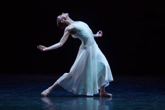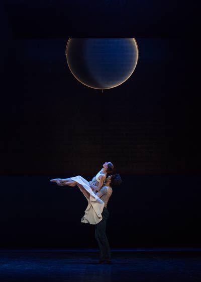 John Neumeier, à la tête du Ballet de Hambourg depuis 1973, est un chorégraphe profondément spirituel, pour ne pas dire mystique. Sa chorégraphie est donc assez proche d’une vision de la mort en quête d’éternité. Et il y a quelque chose d’une antichambre du paradis, dans la scénographie grandiose qui place sur la terre (et le plateau) les « vertes prairies » et aux cieux (dans les cintres) un au-delà de nuées et de limbes éternels, tandis qu’une lune nous indique la course du temps par ses transformations. La gestuelle est, d’une certaine façon, dans ce même registre, on voit passer Nolwenn Daniel en mater dolorosa habillée de bleu céleste, les ensembles ont des allures de pieuses procession, les duos ou trios, si ce n’est quelques sauts qui font voler les robes, restent au bord de l’émotion, pleins de retenue pour ne pas dire componction.