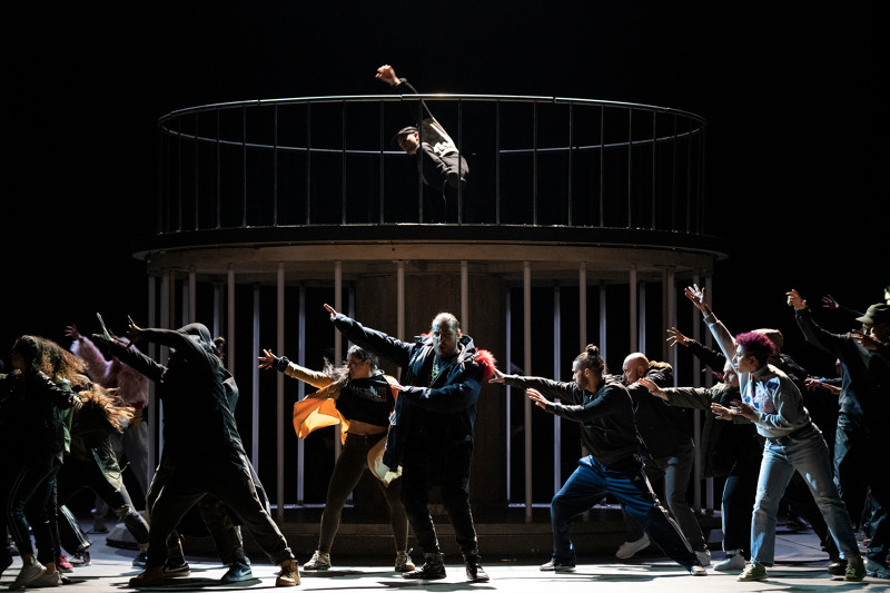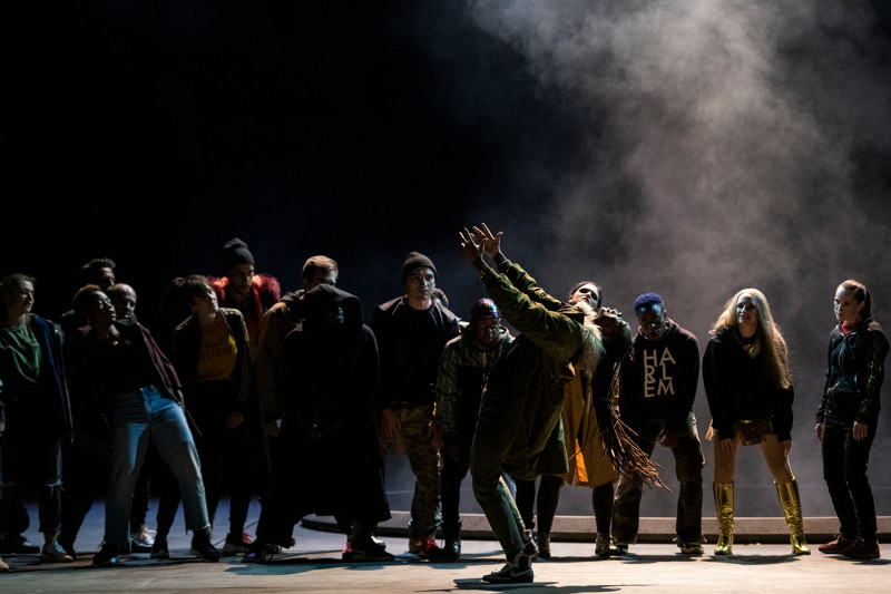 A défaut d’exotisme, serait-ce le folklore d’aujourd’hui ? Car sur la scène de l’Opéra Bastille, s’affrontent des policiers casqués et armés, type CRS, à une foule anonyme en hoodies et baskets, les danseurs de la compagnie Rualité de Bintou Dembélé et les chœurs, qui représentent tour à tour, les Incas du Pérou, les Perses des jardins luxuriants (Les Fleurs) et enfin les Sauvages d’Amérique*. C' est une interprétation.