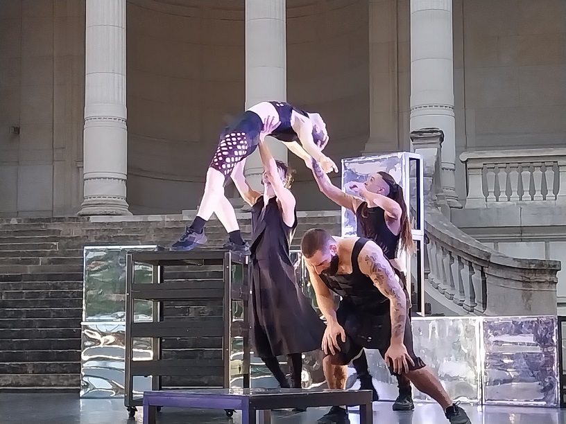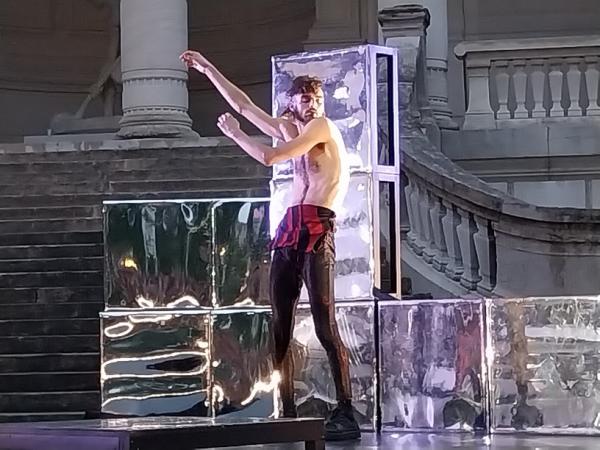 Ensemble ils défient la gravité autant que la masculinité normative, sous l’œil d’une chorégraphe qui aime autant créer en lien avec la population et pour les espaces non dédiés à l’activité artistique. Un par un, ils calligraphient leurs gestes et mettent en relation la sensualité d’un corps ciselé, avec l’architecture néoclassique. Sous la peau, il leur reste peut-être quelques réminiscences de la gente combattante, et ils pourraient constituer un ordre spirituel autant qu’un escadron prêt à la bataille. Mais leur lutte est ludique et renvoie la silhouette du guerrier à son reflet déformé, larmes artificielles et tour de chant inclus. Car l’homme tel que le voit Soraya Thomas dévoile un don majeur, non seulement pour la liberté de corps et d’esprit, mais aussi pour l’autodérision des rites et émotions.
