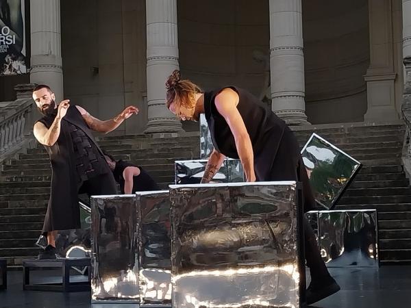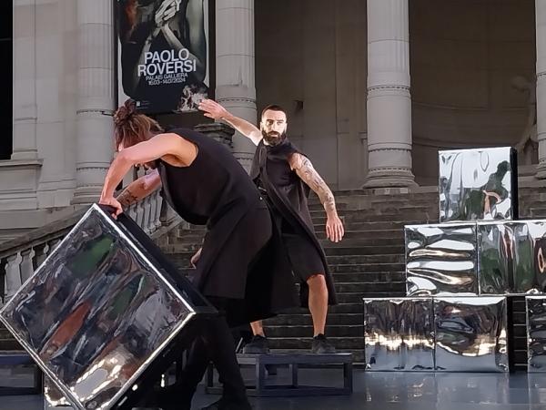 Soraya Thomas n’est pas réfractaire à la transgression. D’où cette danse en mode haute-couture, ascendant punk, dans un paysage de cubes argentés et réfléchissants, confectionnés pour l’occasion, scénographie mobile dont les interprètes s’emparent avec bonheur. Si la connotation féminine de la jupe n’est pas de mise dans toutes les cultures, le mainstream européen en matière de mode reste, quant à lui, attaché aux modèles de rôles. Mais Soraya Thomas détourne tout et les quatre hommes – Pierre Dubosc, Adrien Martins, Gwendal Raymond et Jules Martin – ressemblent, par leurs coiffures indomptées, autant à une troupe de cirque. Mais dans toute son individualité libératoire, le quatuor reste parfaitement uni et solidaire, affichant un individualisme qui se fond dans une expérience collective vécue et revendiquée.