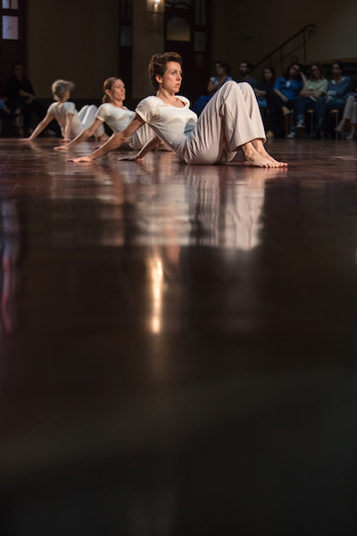 Lucinda Childs a sans doute voulu renouer avec cette perspective multiple lors de la création à la salle genevoise Pitoëff, en disposant le public en quadri-frontal autour de la pièce et lui ouvrant le balcon formant un U. La dimension d’entrelacement entre les trajectoires conduites en cercles et demi-cercles qui s’étirent confine à une constellation distribuant les distances séparant les interprètes de un à douze mètres. De l’unisson à la diversification de l’action, l’air ne cesse de circuler merveilleusement entre des danseuses.