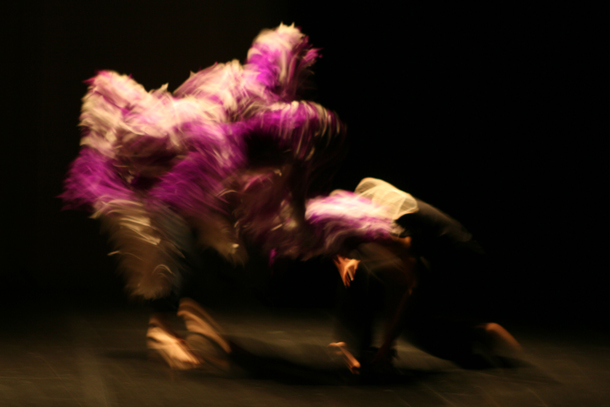 Petit à petit, tout en conservant leurs mouvements de base, tout ça se met à déraper gentiment. Si les plumes sont bien d’autruche, la gestuelle fait signe vers d’autres oiseaux, jusqu’à rappeler plutôt des gallinacées. Drôle et tragique en même temps.