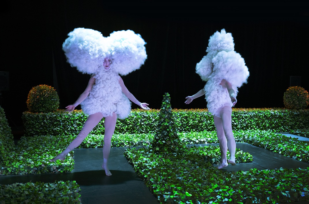 Aussi ce quatuor est en fait un double duo, où Ruth Childs et Sylvain Prunenec en poufs sur leurs nuages, séduisent par leurs mimiques et gestuelles, ou bien dans de jolies parodies de ballet. Car Clédat et Petitpierre ont mené des recherches sur le ballet burlesque, petit frère oublié de la danse baroque, art qui « a vu le jour juste avant la comédie ballet de Molière » et « a été créé en réaction à la danse géométrique, ésotérique » baroque. « Nous avons ainsi découvert avec beaucoup de joie de lointain.e.s ancêtres artistiques dont les préoccupations étaient exactement les nôtres », disent-ils.