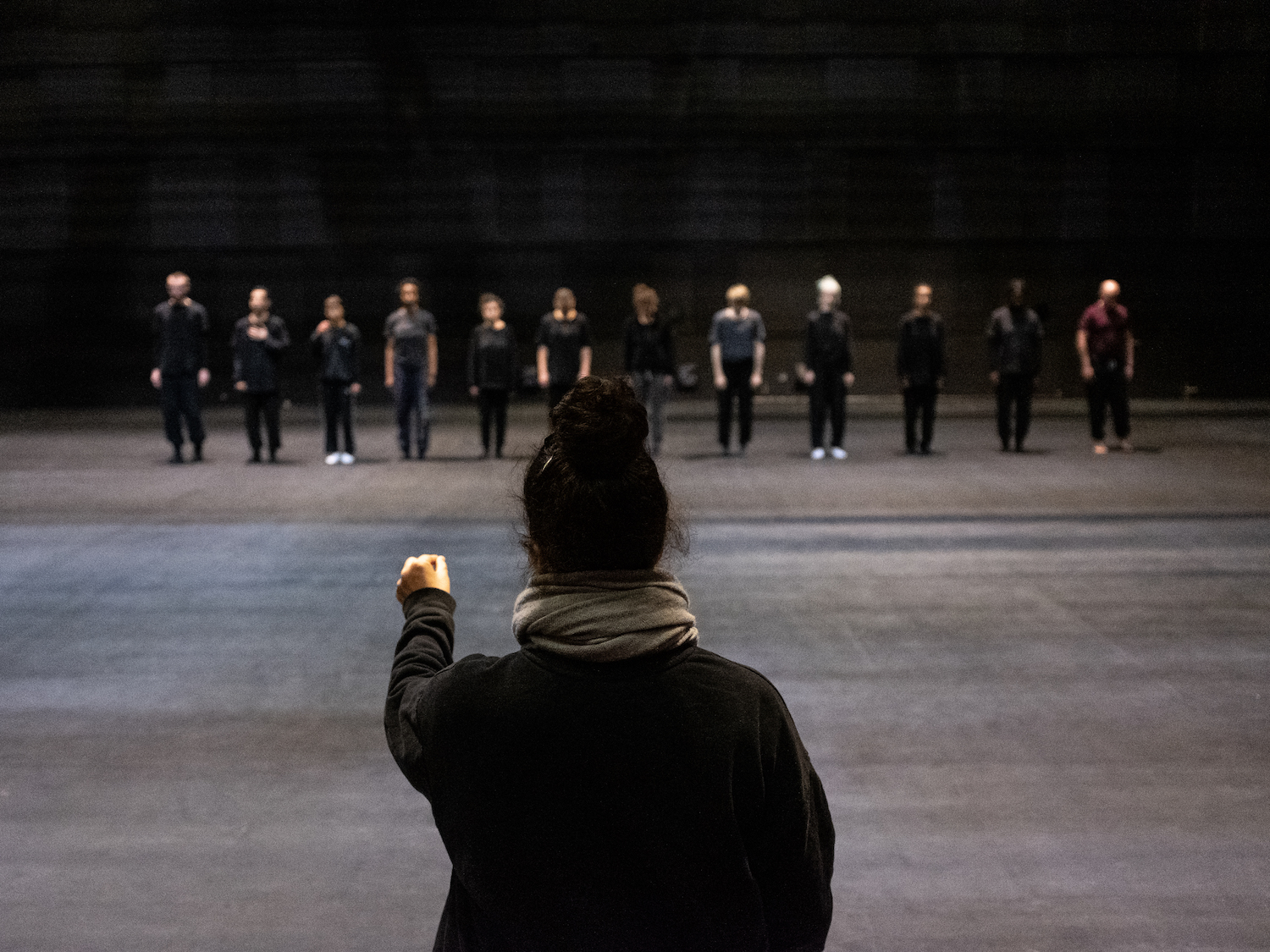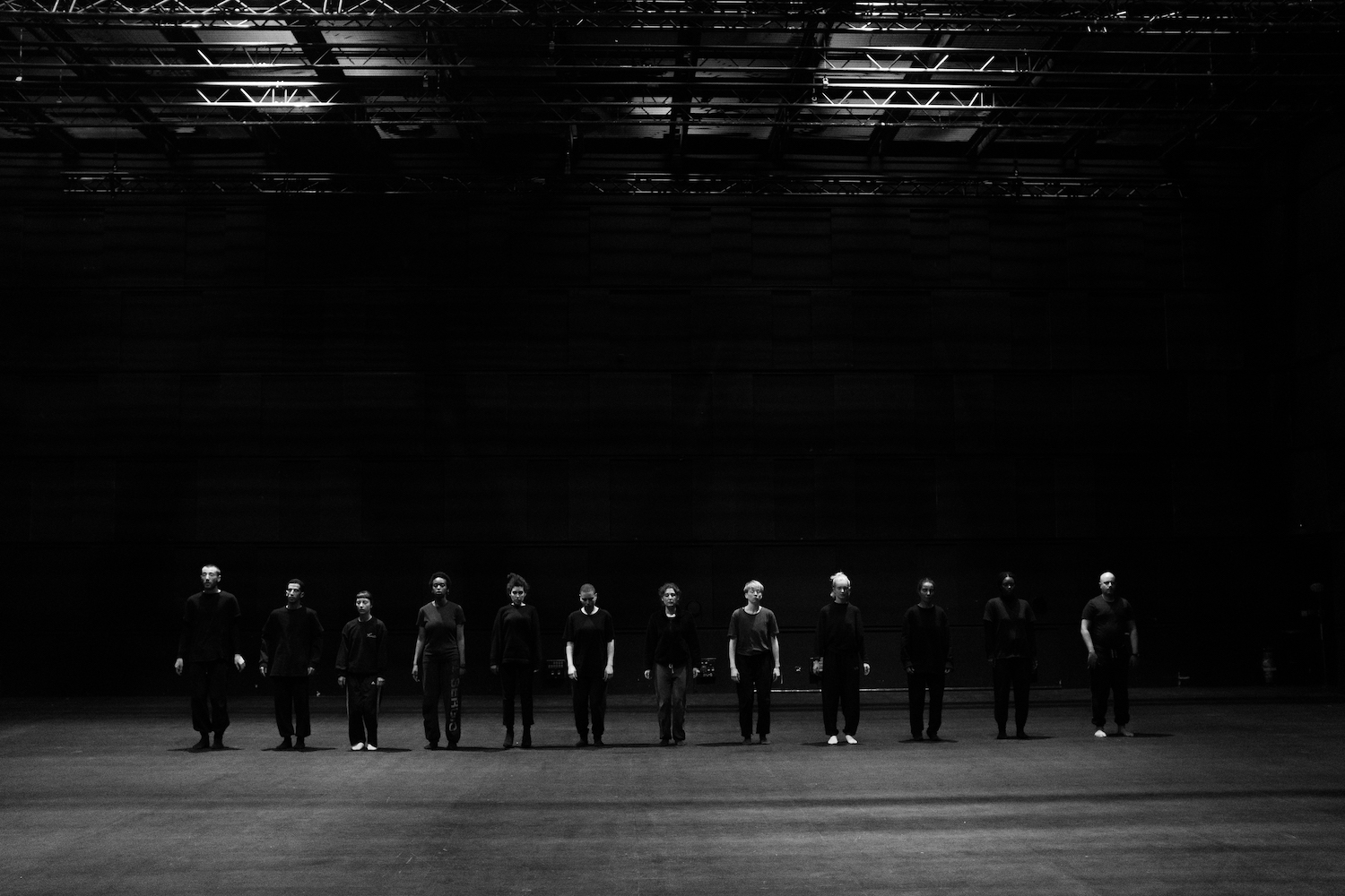 La multiplication des interprètes rend presque palpable cette immuabilité du temps et de l’attente, distend l’espace mais aussi modifie légèrement la pièce initiale car chaque corps se distingue de l’autre par d’infimes différences, parfois accentuées par la chorégraphe (comme dans notre exemple du visage au ciel), parfois impromptues (mais sans doute pas involontaires) car chaque être a sa façon singulière et irréductible de prendre le mouvement, et chaque corps insuffle, à son insu, une présence unique qui se fond dans cette masse chorale.
