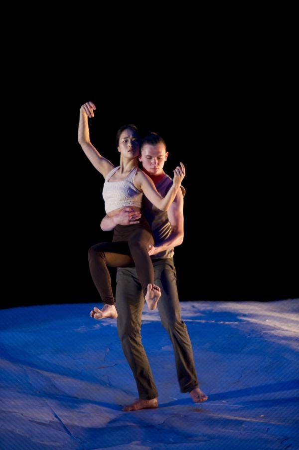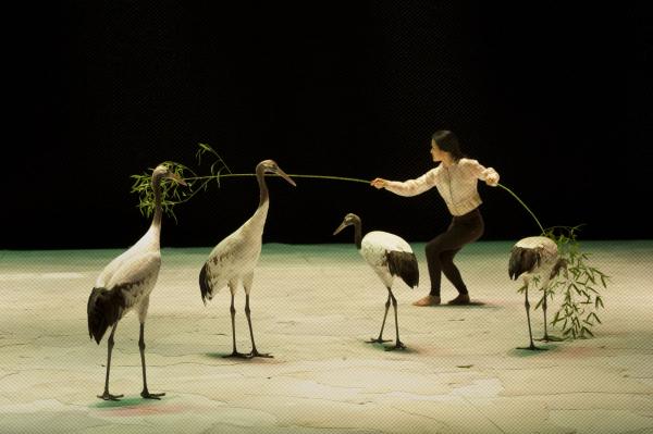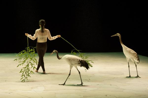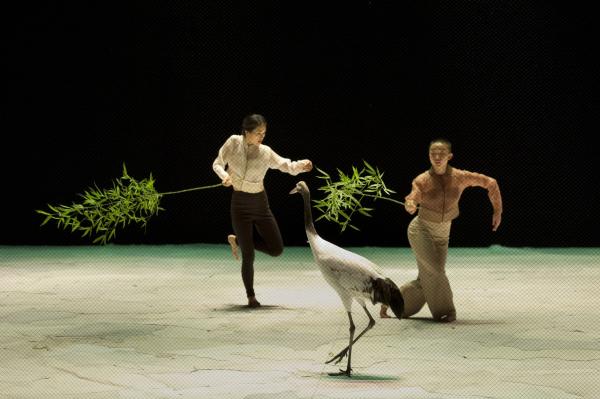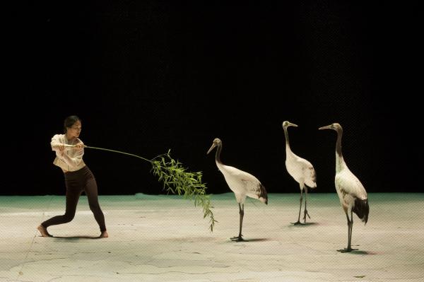 Sun-A Lee est particulièrement en harmonie avec les oiseaux. Peut-être que son physique de Dame oiselle, n’y est pas étranger, mais cela ne suffirait pas à expliquer la grâce avec laquelle elle se met à l’écoute des grues, emprunte à leurs attitudes, pour en faire son propre naturel. Peut-être aussi flotte-t-il dans cette pièce une atmosphère apaisée et une esthétique profondément asiatique qui correspondent à merveille à sa danse. Lenteur, lumières tamisées et dorées, ponctuent ce spectacle subtil où chacun, des hommes et des oiseaux a sa partie et son univers qui se côtoient sans jamais se confondre. La scénographie, à la fois sobre et belle nous transporte dans ce monde à part, où s’engendre une chorégraphie à tendance zen, tout en retenue, que seules viennent troubler quelques battements d’ailes et frissons de plumes.