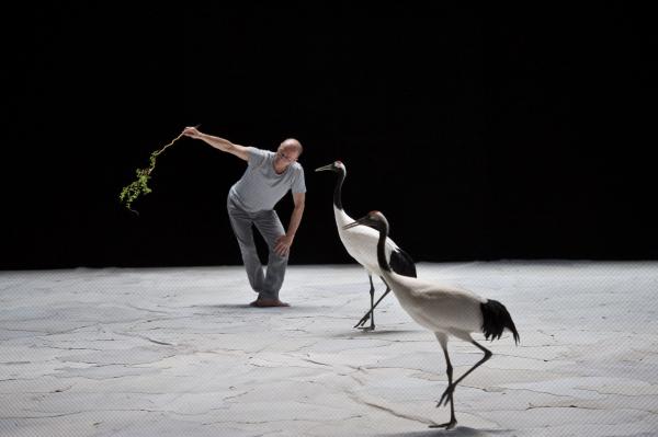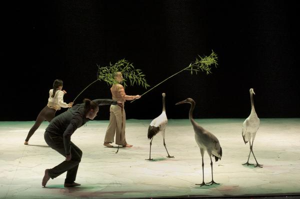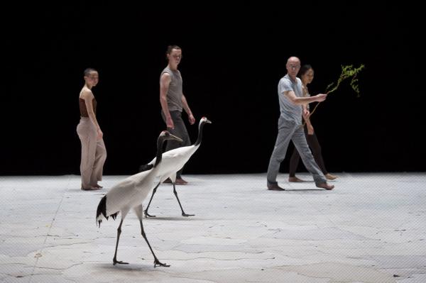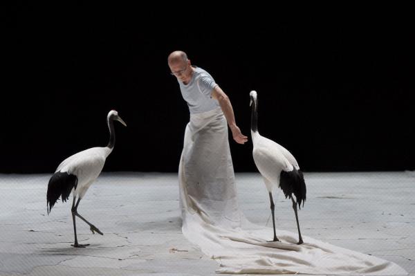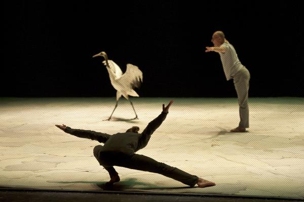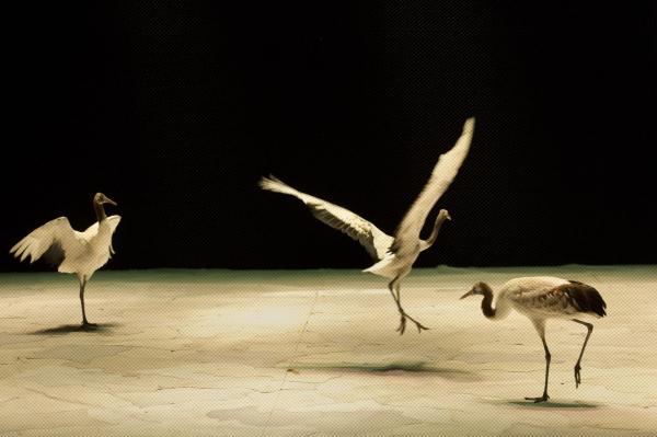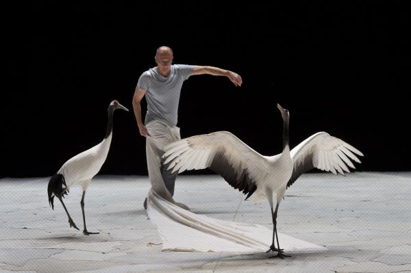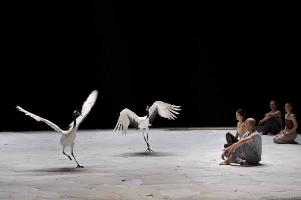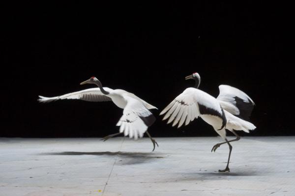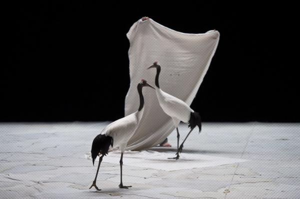 Joueuses, joyeuses, et même impertinentes, on a pu apprécier sur la scène du Théâtre national de Chaillot, que les grues menaient la danse à leur façon. Contrairement aux cygnes de Swan (précédente pièce du même chorégraphe), elles n’ont aucun penchant à suivre les danseurs. Elles les accompagnent de leurs cous flexibles et de leurs envols planants. Parfois elles sautent comme pour s’amuser, se suivent et se lancent dans des courses improvisées. Dansent-elles ? En tout cas, les six grues tiennent le plateau, c’est certain.