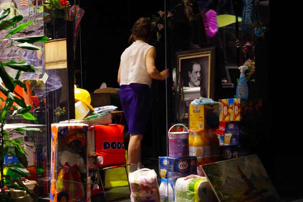 Immergés dans le ressac du son amplifié de la photocopieuse, nous voilà happés dans un nouvel espace où la transparence est la règle : la surface de co-working où le travail peut s’opérer à la vue de tous. Là, dans ces cages en verre, gît le totalitarisme larvé, et la contrainte faite à l’individu de s’incorporer le credo néolibéral. Là circule une petite communauté humaine, qui, comme une autre société hypercivilisée, celle des fourmis, apporte à chaque instant, d’autres objets comme autant de « besoins » pour meubler le vide de leurs bureaux et de leurs vies : packs de bière, de papier toilette, d’eau, petits gâteaux, et autres biens de « consommation courante » et de compensation - cette « fuite latérale2». Peu à peu, s’y ajoutent d’autres bibelots, bidules, choses, censés distinguer chacun de ces hommes et de ces femmes, les qualifier en quelque sorte : photos des petits, affiches, plantes, vêtements, jouets, tableaux, livres, revues, vrai fatras d’inutilités, ou bazar des inanités à l’obsolescence programmée. Et tandis que le rythme implacable de la photocopieuse avale toute velléité d’originalité, Ligne de Crête avance en équilibre entre deux versants : la conformation et la distinction. Le résultat est puissant et d’une ironie acérée, parfois cinglante, et finit par figurer une nouvelle représentation allégorique de la mort, du passage du temps, de la vacuité des passions et activités humaines. Au sein cette accumulation morbide, les interprètes imperturbables continuent à se mouvoir, à manger, à se vider, à se remplir, un petit saut par ci, un petit tour par là, « A force d'appeler ça ma vie je vais finir par y croire. C'est le principe de la publicité3. »