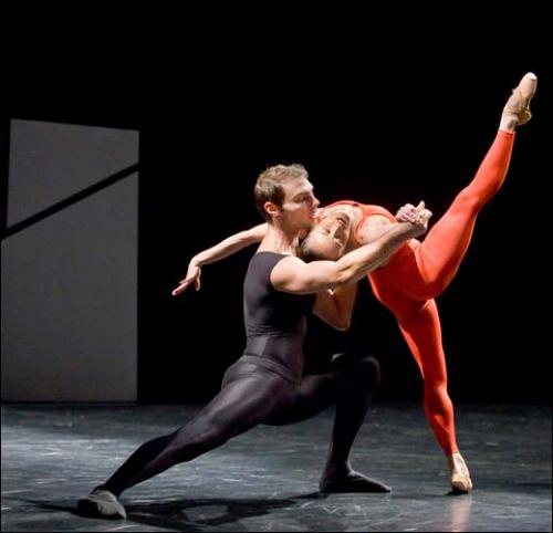 Les hanches se décalent, obligeant chaque mouvement à utiliser, sinon à connaître, les lois du contrepoids. Les pas de liaisons, comme on l’a déjà dit, sont mis en relief : les glissades n’en finissent plus – ou deviennent une nouvelle technique quand elles sont exécutées sur pointes – la jambe d’appui devient une vrille qui se désaxe. Du coup, les trois hommes en noir et la femme en rouge qui semble de ce fait plus une ligne élancée qu’une forme humaine, sont intriqués dans une chorégraphie d’une complexité et d’une célérité qui n’ont d’égales que ces moments de banalité où, brusquement, réapparaissent trois hommes et une femme qui traversent tranquillement le plateau. Mais, ce qui signe définitivement le style forsythe dans cette pièce, sont ces corps incroyablement connectés de la pointe du crâne au dernier orteil, où chaque geste, chaque segment s’articule à l’autre, de façon si « huilée » que l’on croirait voir un cours extraordinaire d’anatomie du danseur. Nina Khokkam, Jonahtan Archambault, Fabio Dolce et Yoann Rifosta excellent dans ce quatuor, frisant sans cesse le danger avec une aisance et une familiarité qui déconcertent totalement.