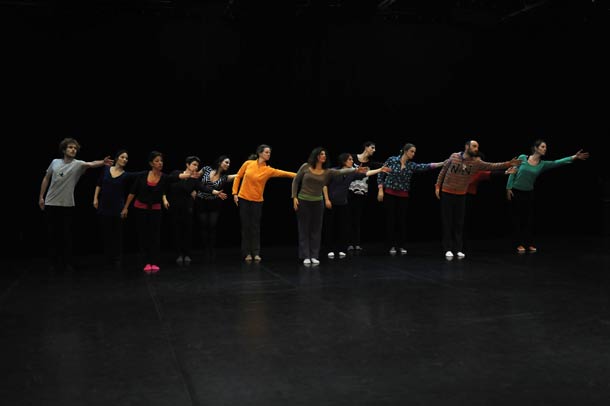 À Cour, les élèves du Conservatoire à Rayonnement Régional Francis Poulenc de Tours ; à Jardin les participants de l’Atelier chorégraphique du CCNT. Chaque groupe étant assis sur des chaises de part et d’autre du plateau.